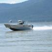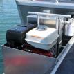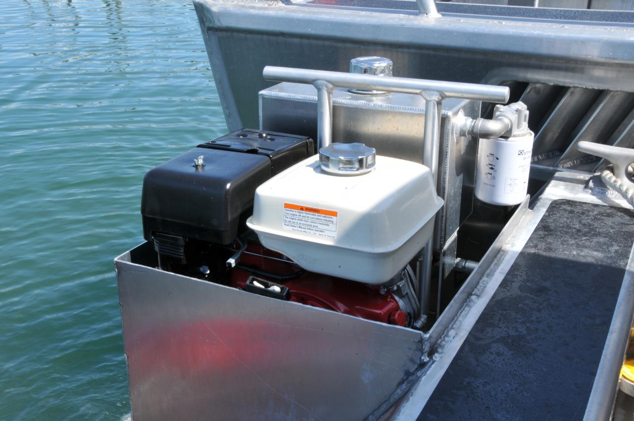 Boat specs: 46 mph top speed, cruises at 30 mph at 3,800 rpm, with twin 150 Mercury OptiMax outboards. Painted epoxy nonskid decks with everything else left unpainted for easy cleaning. Bait table under windshield for easy use, made of plastic for easy care and cleaning. 5.5’ x 6' walk-around cabin with one side door. Honda pack for running a hydraulic winch.