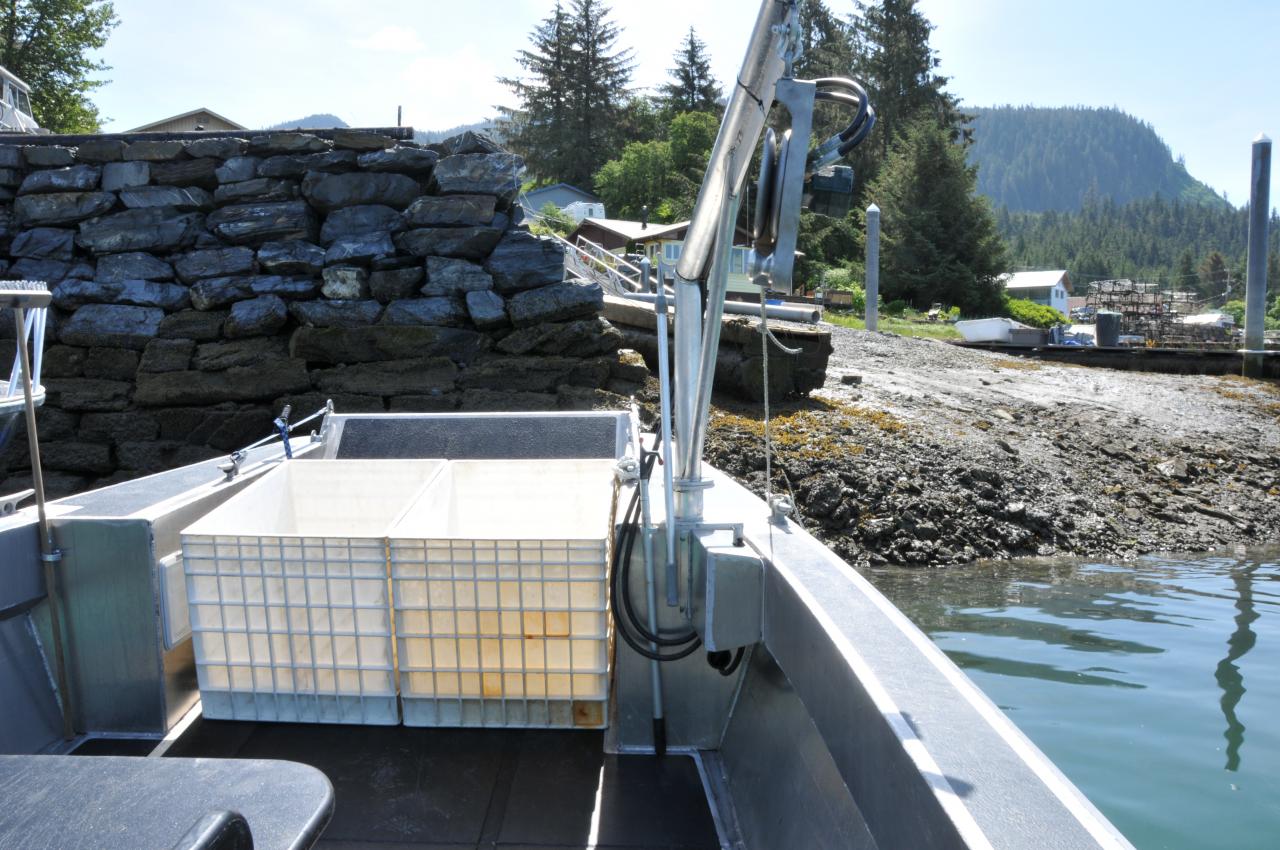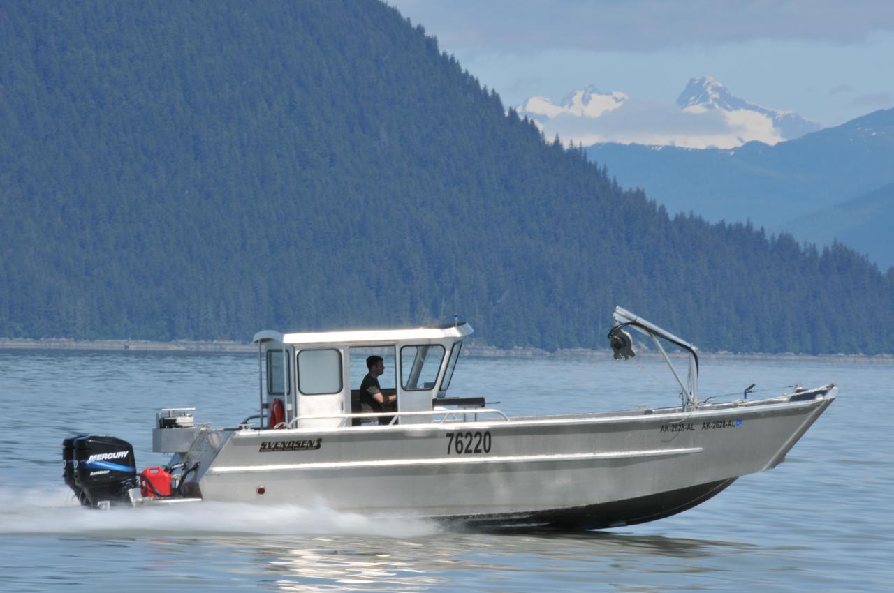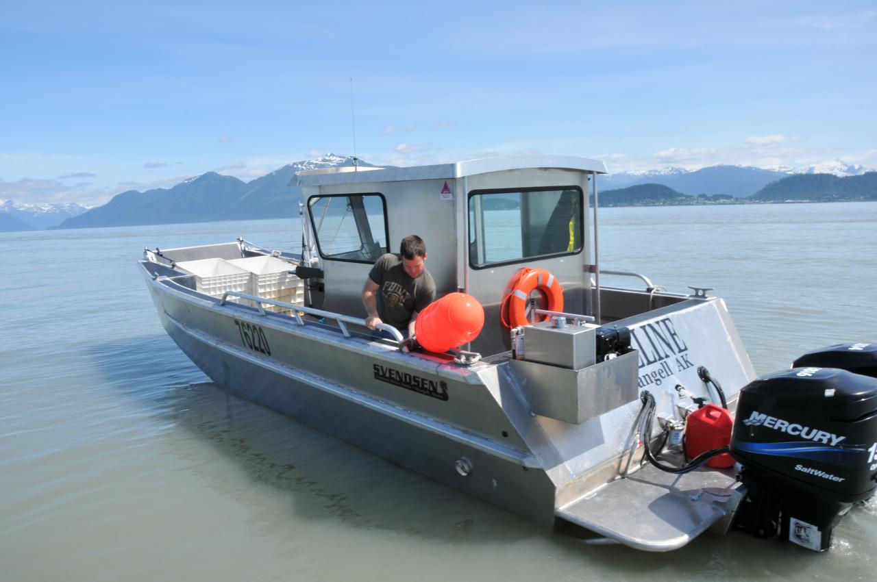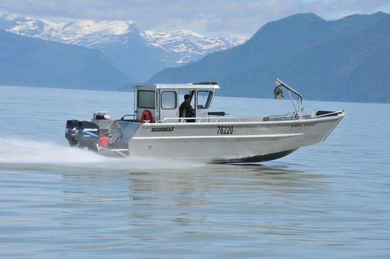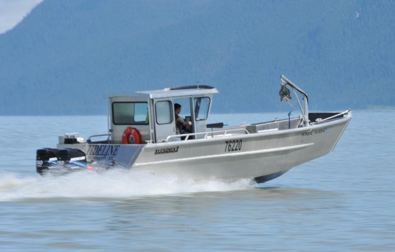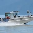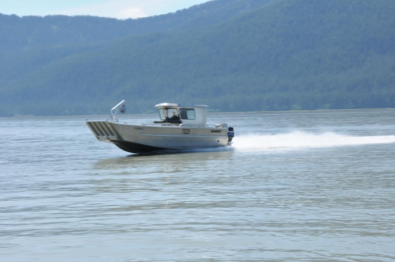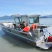 This 30' Landing Craft-style boat is used for crabbing. It’s fast but has low gas consumption, to make short work of getting to the crabbing grounds and pulling pots. A lowerable bow door makes loading and unloading gear a snap.